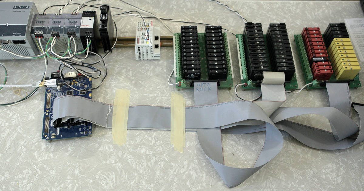This is the current test bench for ep5BAS code. It’s a very temporary lash-up, awaiting installation on a permanent platform. Optical isolation between the control electronics and the real world, with its voltage transients, is provided by the modules on the OPTO racks. The black modules are 120vac solid-state relay outputs at 3½ amps; the red-brown modules and single black one are dry-reed mechanical output relays used when zero voltage leakage is required; and the yellow modules are 120vac solid-state inputs. These modules and the printed-circuit-board racks that they are affixed to are industry standards and are available from several manufacturers.